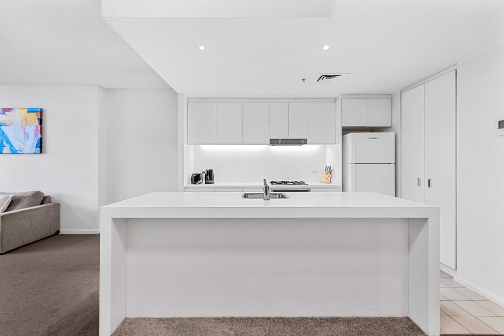 - Sleek white island-style kitchen, premium appliances, gas cooking, dish drawer
