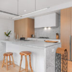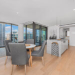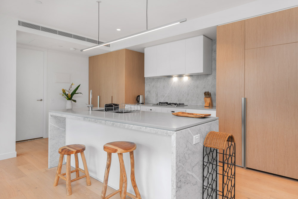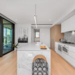 This large one-bedroom apartment features a fully appointed kitchen with a stone island benchtop, Miele appliances, an open-plan living and dining area with timber flooring leading to entertainer’s balcony.