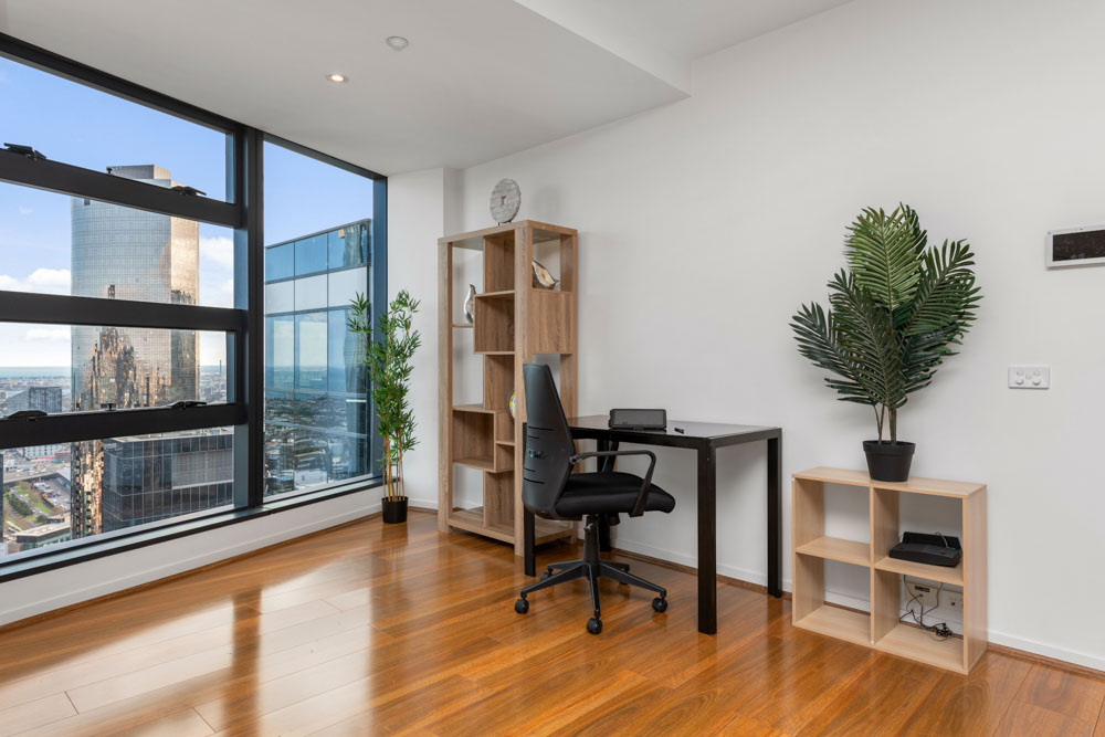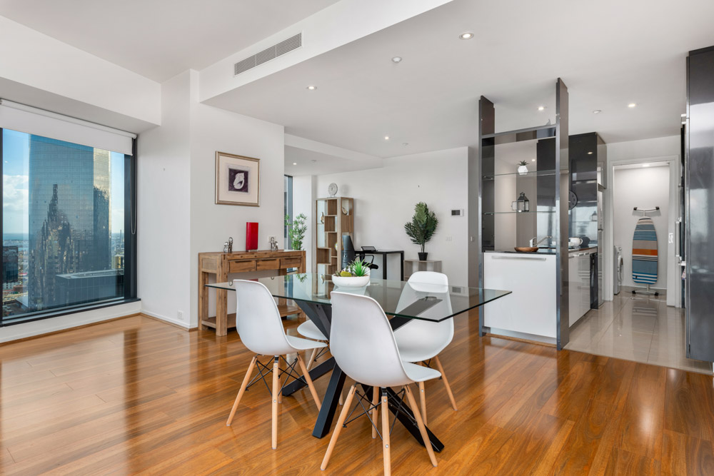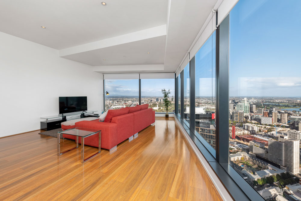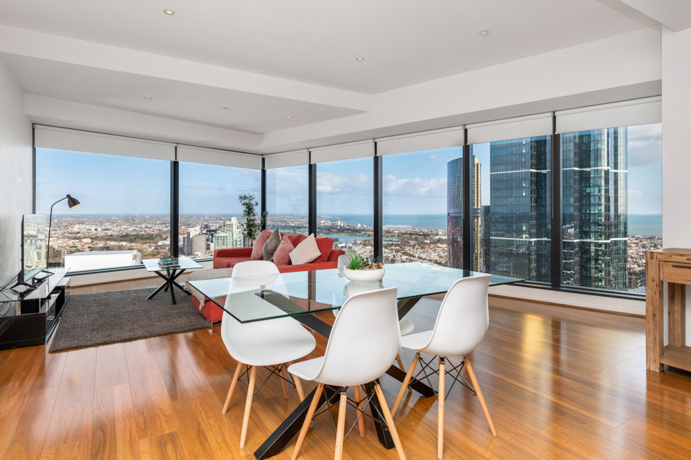 This dazzling 55th floor 2 bedroom plus study, 2-bathroom Eureka Tower entertainer showcases picturesque 180-degree views sweeping over the Dandenong Ranges, Royal Botanical Gardens, Port Phillip Bay, Albert Park Lake, right through to Williamstown.