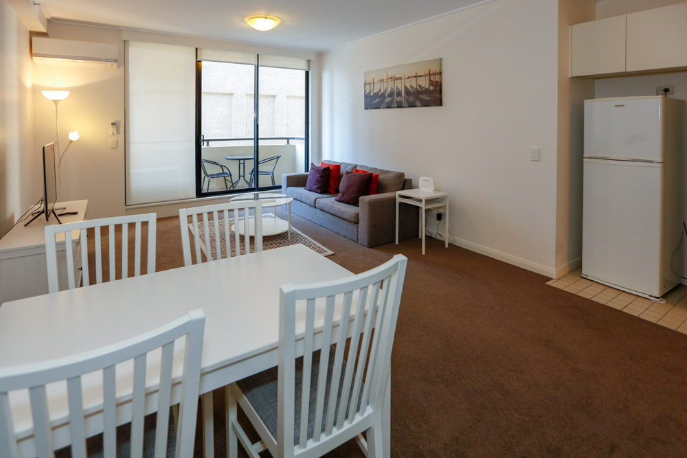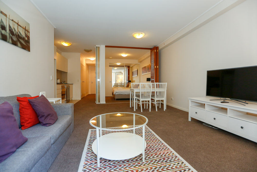 This apartment sits right in North Sydney giving you immediate access to office and retail areas, a short walk will take you to Greenwood Plaza, local restaurants, cafes and rail and bus connections for a small trip across the Sydney Harbour Bridge into the Sydney CBD. This studio apartment has one bi-folding timber shutter, which can be opened to achieve a spacious open plan living area or closed to provide the privacy of a one-bedroom. From the balcony, you can enjoy the city lights and even a harbour glimpse, a fully equipped galley-style kitchen, unlimited Wi-Fi and internal laundry.