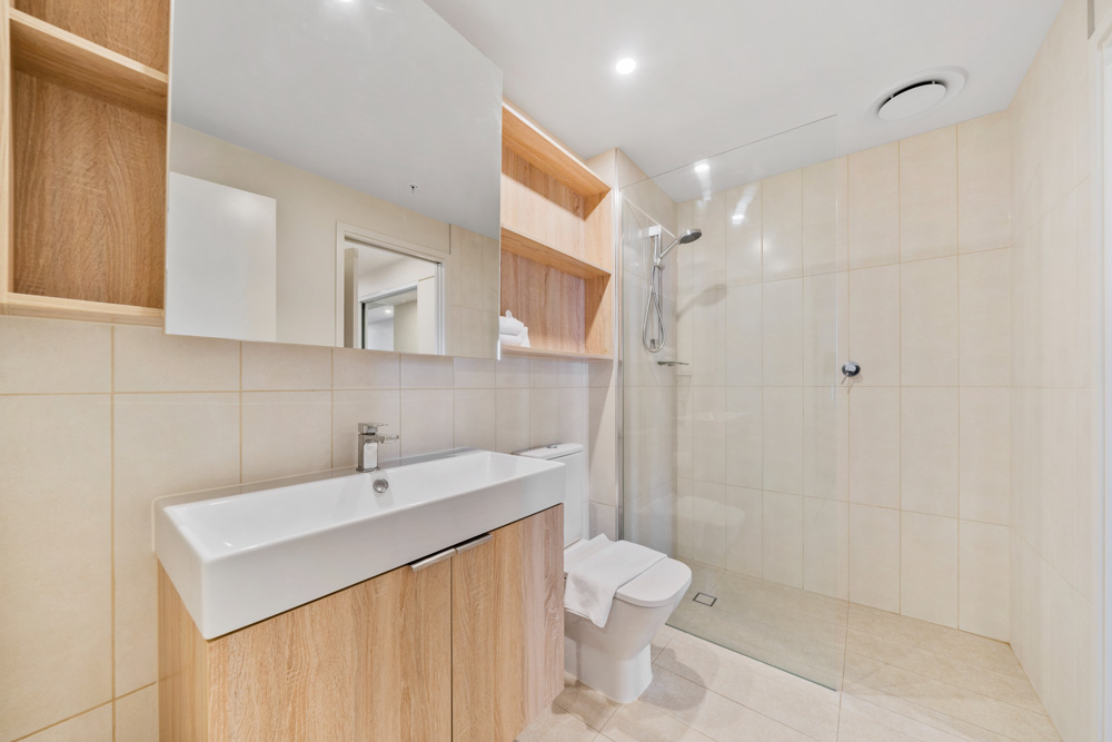 This spacious open-plan living and dining area, captures the eastern aspect, filling the interior with natural light. Sliding glass doors offer seamless indoor/outdoor living with direct access to the balcony. A well-appointed galley-style kitchen features quality European appliances, stone benchtops and plenty of storage. The main bedroom is generous in size and features a built-in wardrobe with plenty of storage. The bathroom has premium fixtures throughout, there is also a concealed laundry and linen cupboard.