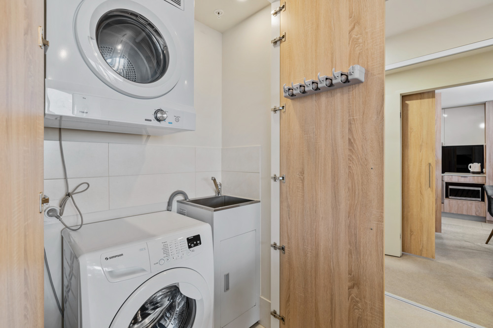 - Concealed laundry and linen cupboard
